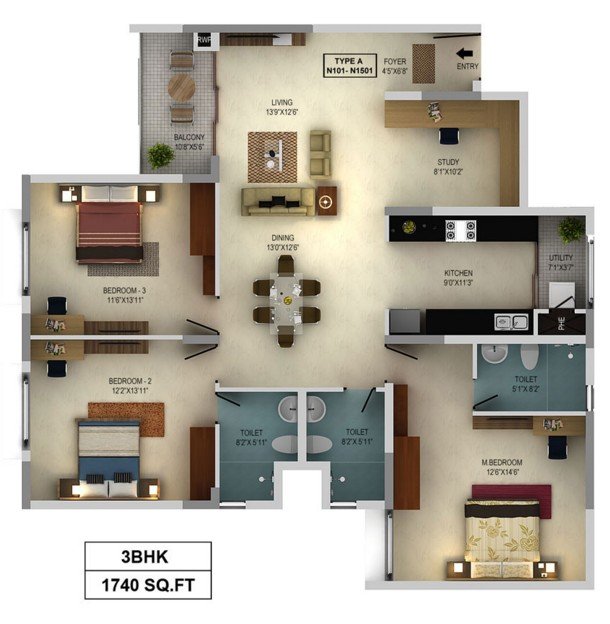 3 BHK+3T(1,740 Sq Ft)₹ 95.53 L*