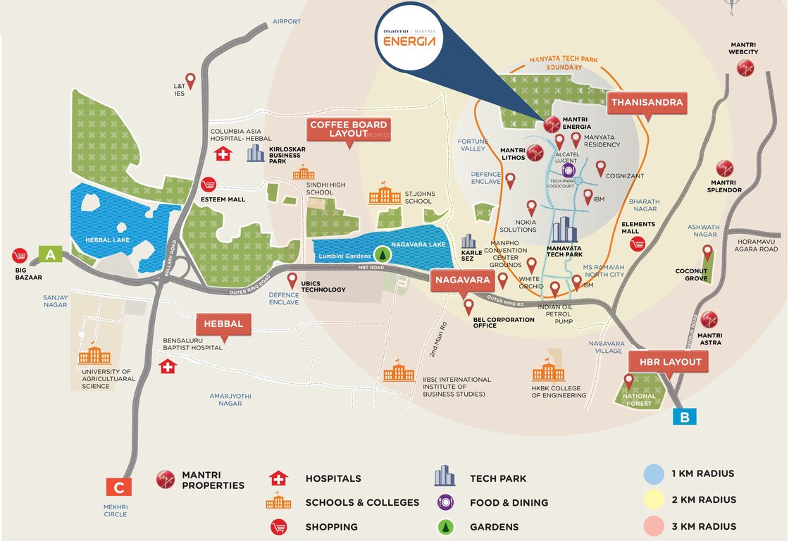 Mantri Energia is a novel residential apartment blended with innovative architecture and Energy. Mantri Energia is located precisely inside Manyatha Tech Park Hebbal, North Bangalore . Mantri Energia is sprawled across a land area of 11.5 acres consisting of 6 towers each having a total of 18 floor.Each individual tower constitutes 148 apartments which will have 77% carpet area. Mantri Energia is proud to offer trendsetting and first of its kind amenities. Mantri always focuses on bringing the best of modern innovation to all its projects, this project is the latest offering of Mantri’s smart home range, combining the best elements of technology and energy conversation the structure redefines luxury living. The residence is well connected to prime business locations in the city, prominent educational institutes and popular shopping destinations. These designer apartments have contemporary architecture, natural ventilation and classy clubhouses. The apartment also offers crèche services to the residences keeping in mind the requirement of working parents.